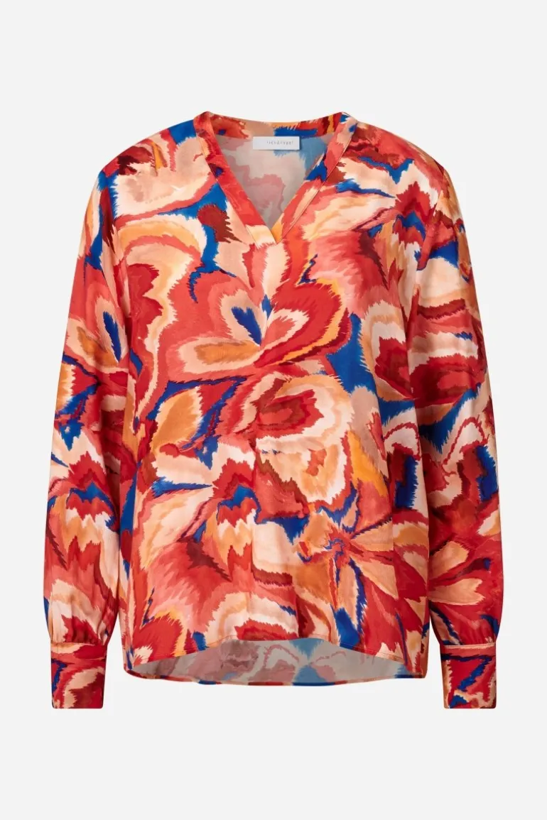 Diese elegante V-Neck-Bluse wird mit ihrem floralen Print in warmen Orange- und Blautönen zum Highlight für Freizeit- und Abendlooks. Der lockere Schnitt und reine EcoVero-Viskose garantieren ein seidenweiches Tragegefühl.