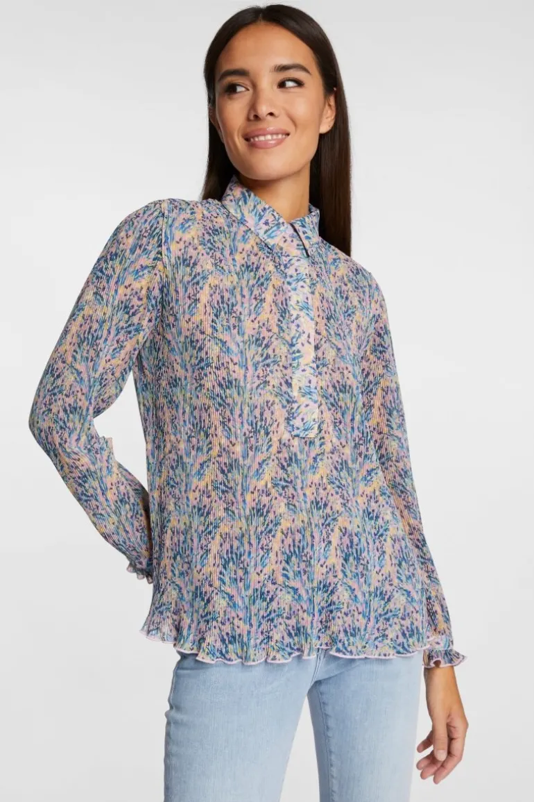 Mit ihren vielen kleinen Plisseefalten wirkt diese weich fließende Bluse extravagant. Passend dazu präsentiert sie einen blurry Print. Im classy Chic kommen der Hemdkragen und die gerüschten Manschettenärmel. Eine Zick-Zack-Naht ziert den offenkantigen Saum.