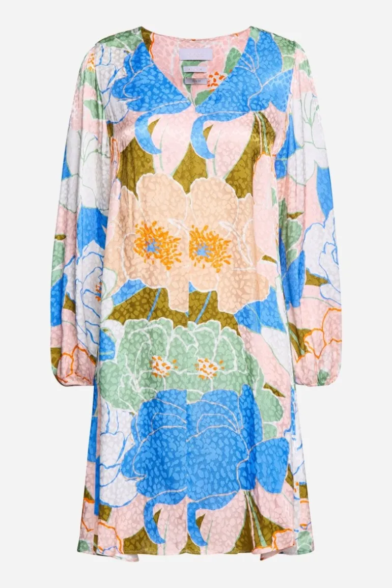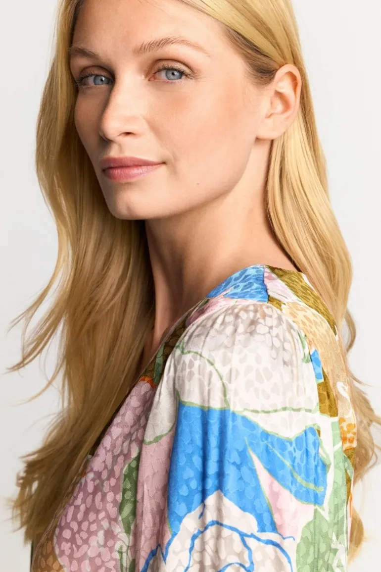 Dieses elegante Blusenkleid wird dank lebendigem Blumenprint in frischen Blau- und Pastelltönen zum vielseitigen Must-have für Deine Garderobe! Die fließende Passform und der feminine V-Ausschnitt sorgen für einen luftigen Tragekomfort.