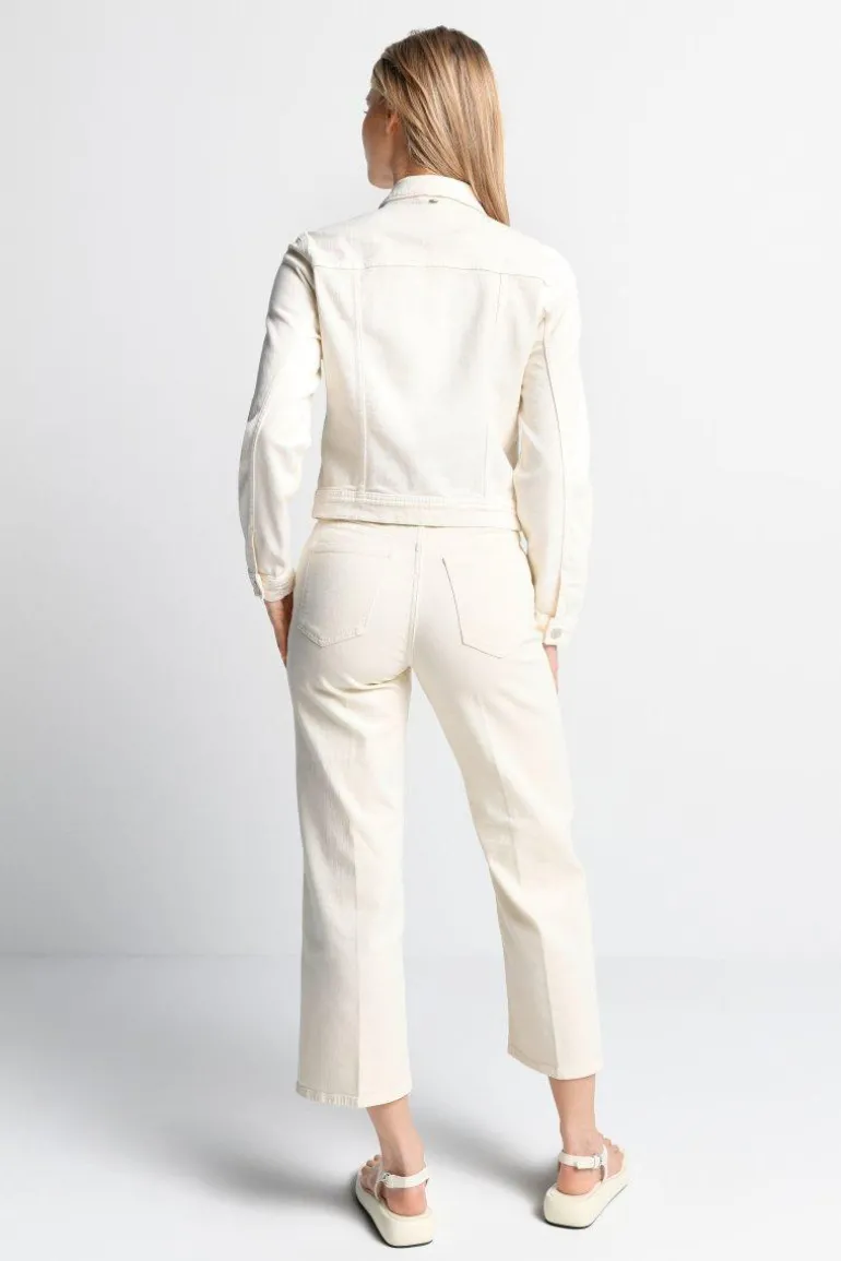 Diese cremefarbene Jeansjacke mit Druckknöpfen ist ein stylisches Must-have für jeden Kleiderschrank. Wir kombinieren sie am liebsten im Monochrom-Look für einen lässig-eleganten Style.
