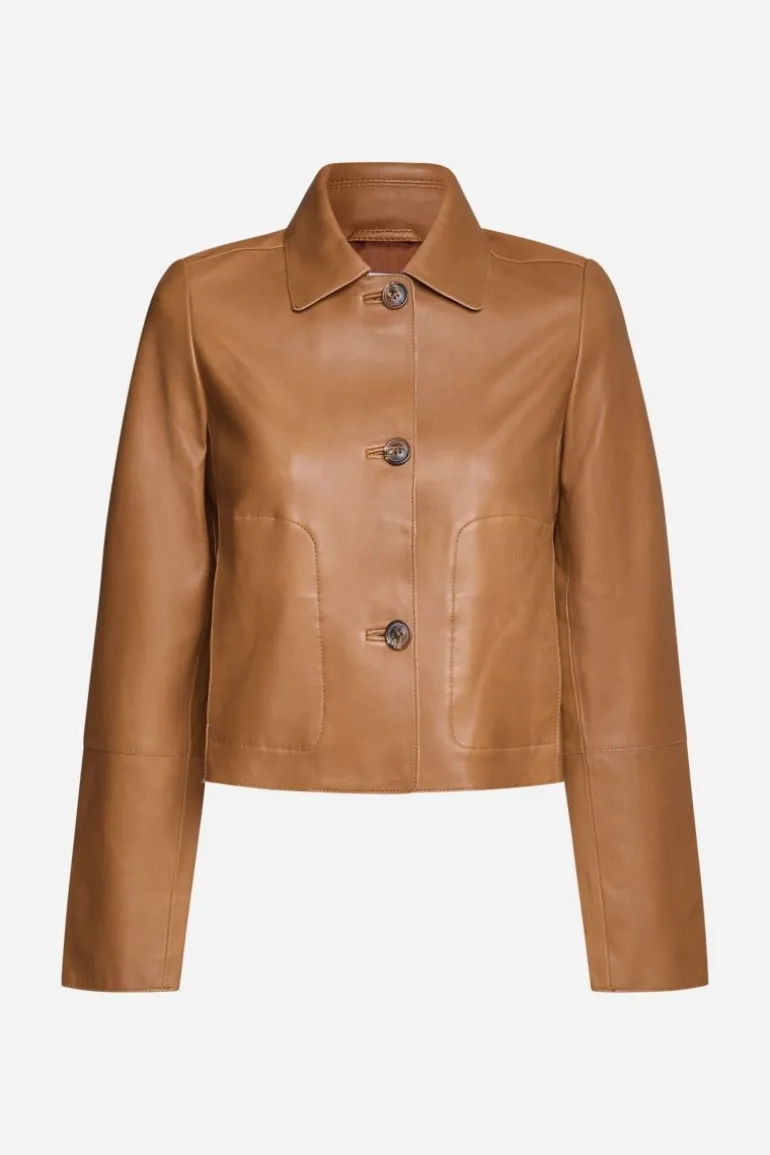 Diese kurze Lederjacke in sattem Karamellbraun kombiniert klassisches Design mit modernem Chic! Die hochwertige Verarbeitung aus glattem Leder, der stilvolle Kragen und die Knöpfe machen sie perfekt für urbane Looks.