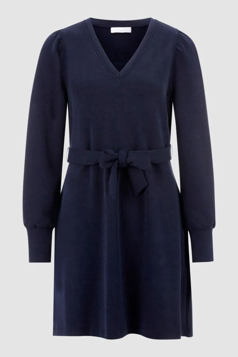 Dieses Minikleid betört mit seinem samtig weichen, kuscheligen Interlock-Jersey. Ein Bindegürtel formt die ausgestellte Silhouette. Ein V-Neck und gerippte Manschetten unterstreichen den comfy Look. Obermaterial: 52% Modal, 42% Polyester, 6% Elasthan Waschbarkeit: Schonwaschgang 30°C