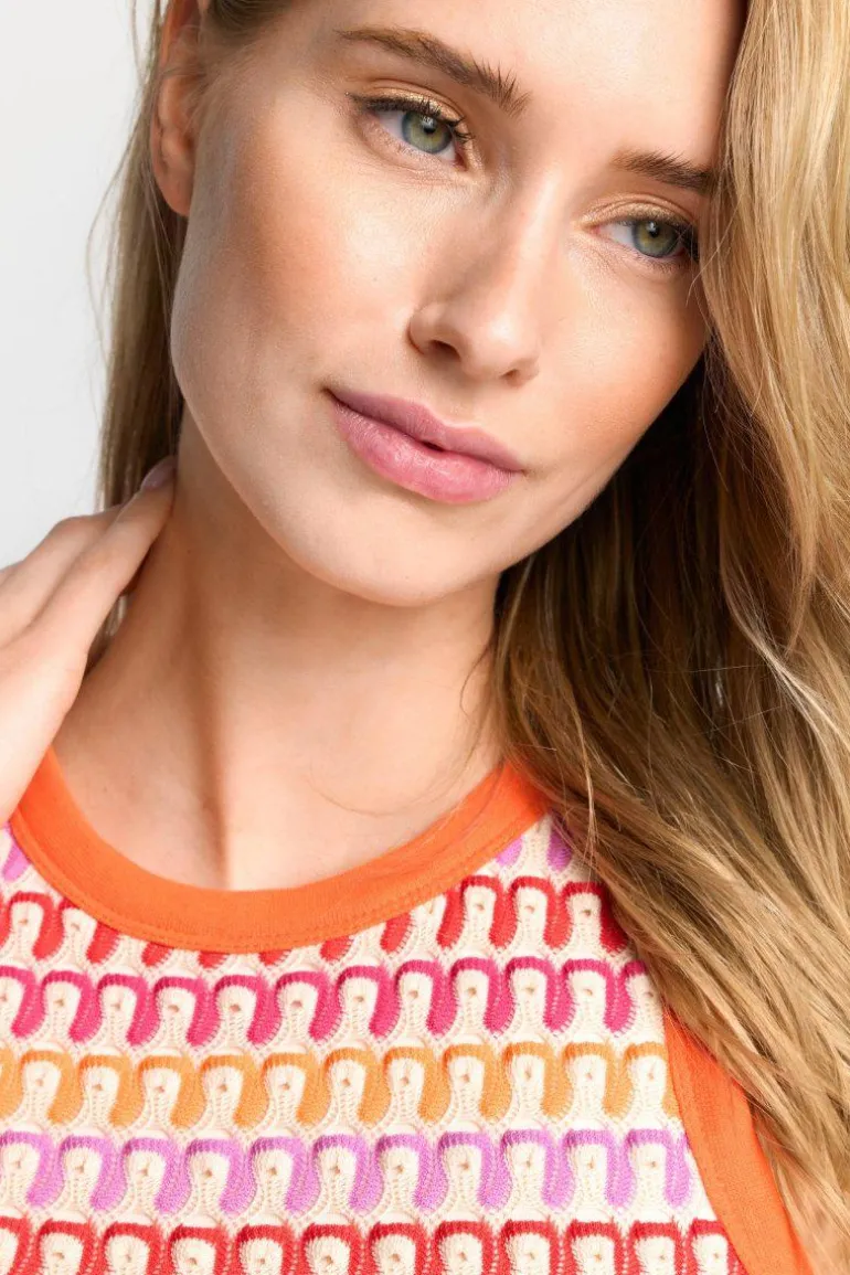 Dieses figurbetonte Statement-Kleid aus Jerseystrick präsentiert sich mit einem farbenfrohen Retro-Muster. Dank des ärmellosen Schnitts ist es sowohl für Sommertage als auch für Gartenpartys und Dinnerabende ein Must-have!