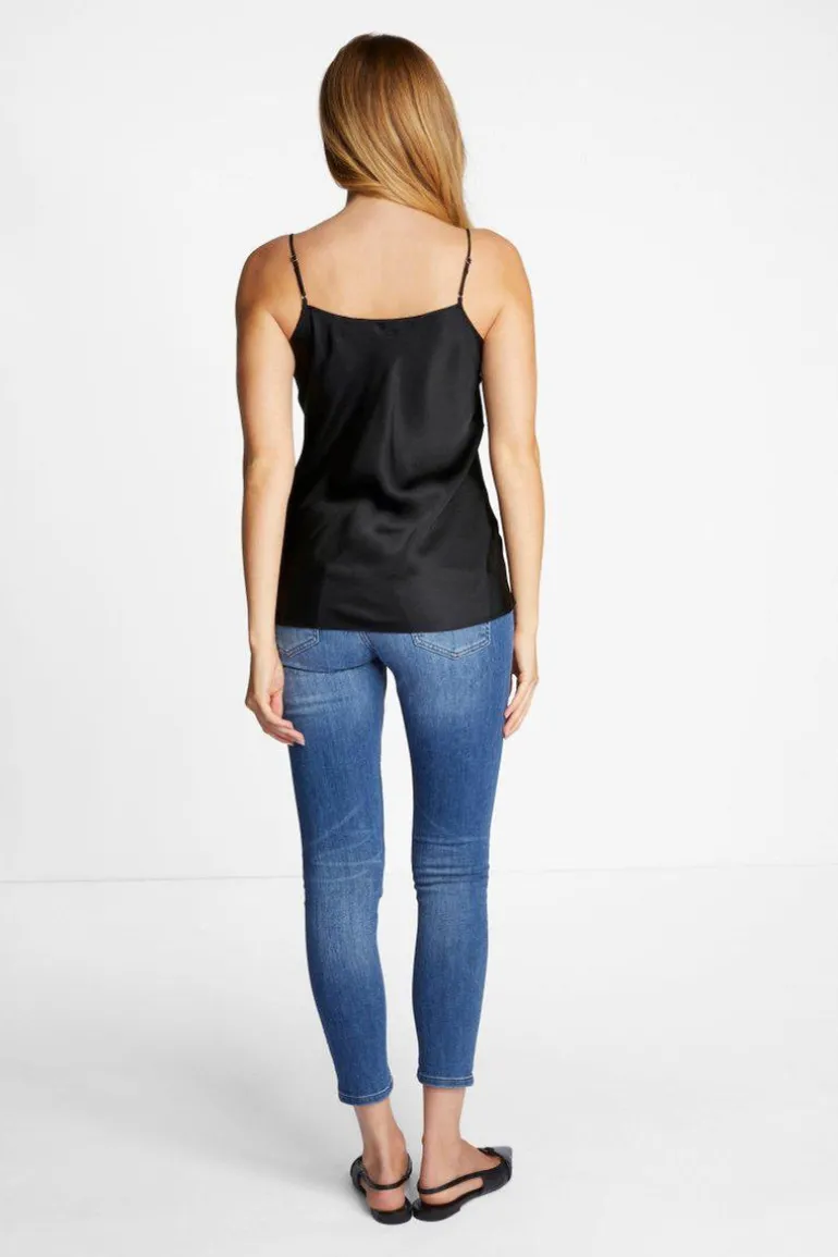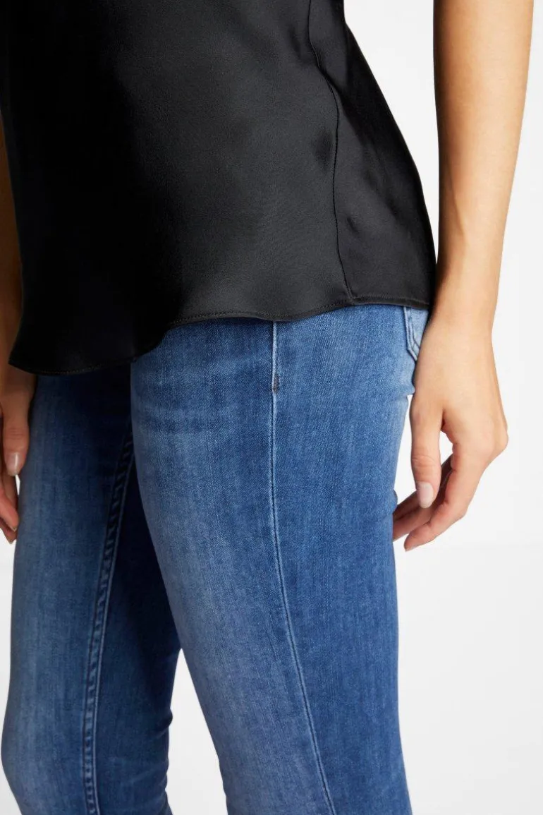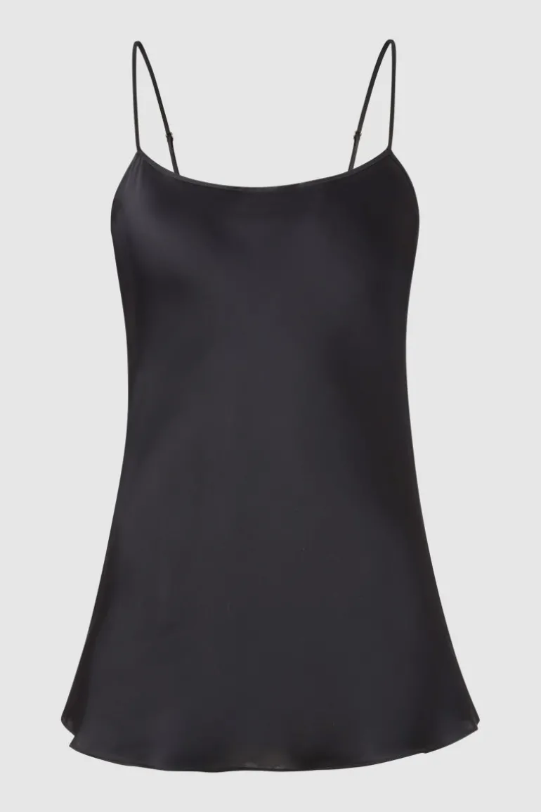 Ein weicher Griff und fließender Fall kennzeichnet dieses glänzende Spaghettiträger-Top. Es zeigt sich figurnah mit einem nachhaltigen Material-Mix im Satin-Glanz dank der Seide. Die Träger sind verstellbar. Obermaterial: 75% Acetat, 25% Seide Waschbarkeit: 30°C, Schonwaschgang