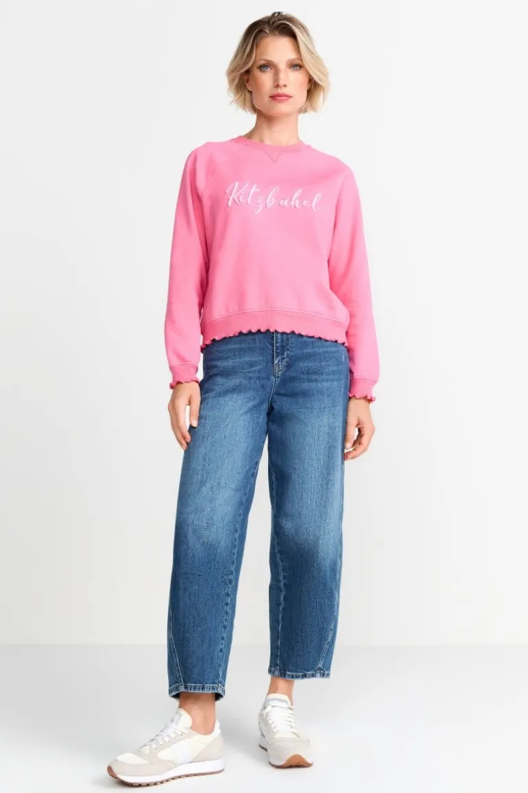 Dieser gemütliche Statement-Sweater vereint einen sportiven Look mit Eleganz! Die Raglanärmel und die dekorative V-Naht am Rundhalsausschnitt sorgen für Lässigkeit, während die Rüschen-Details an den Säumen einen femininen Touch verleihen.