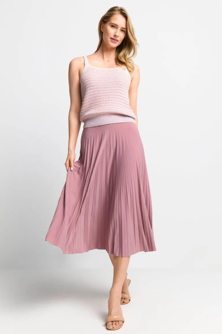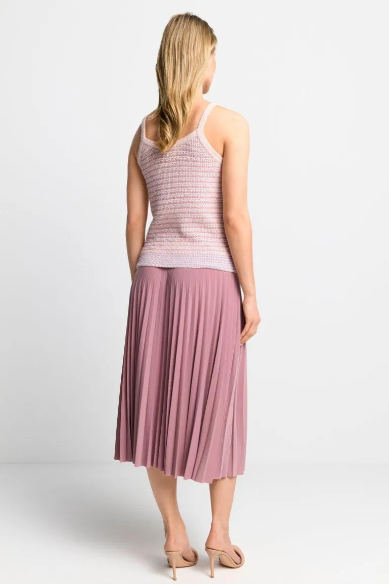 Das ärmellose Strick-Top aus weichem Frotté in Rosa ist ein Must-have für den Sommer! Die gestreifte Strickoptik verleiht dem Top eine elegante Note. Perfekt kombiniert wird es mit einem fließenden Plisseerock für einen femininen Look.