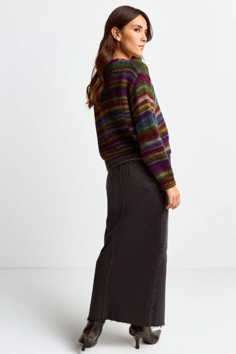Diese trendige Strickjacke mit V-Ausschnitt ist ein Must-have für lässige Freizeitlooks! Die bunten Kristallknöpfe und das dunkle Streifenmuster mit Glanzgarn machen den Cardigan zum It-Piece für elegante Layering-Outfits.