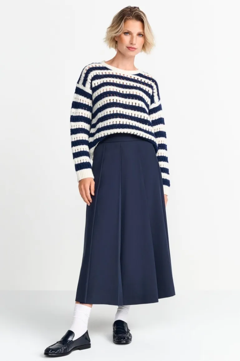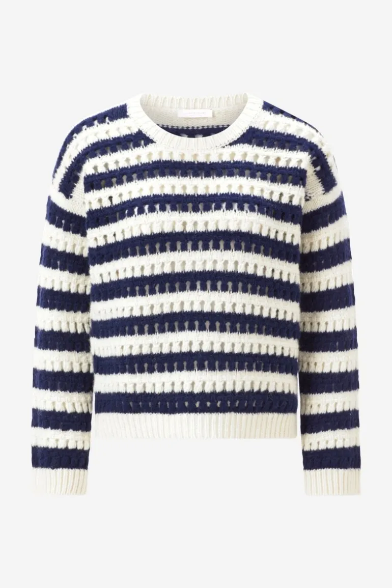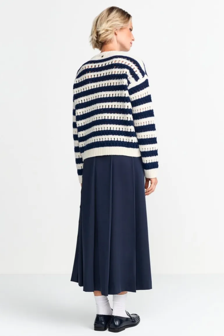Dieser gestreifte Lochstrickpullover vereint maritimes Flair mit modernem Chic! Der lockere Schnitt mit überschnittenen Schultern verleiht jedem Deiner Outfits einen lässigen Touch. Wir kombinieren ihn zu einem Rock, weißen Socken und schwarzen Loafern.