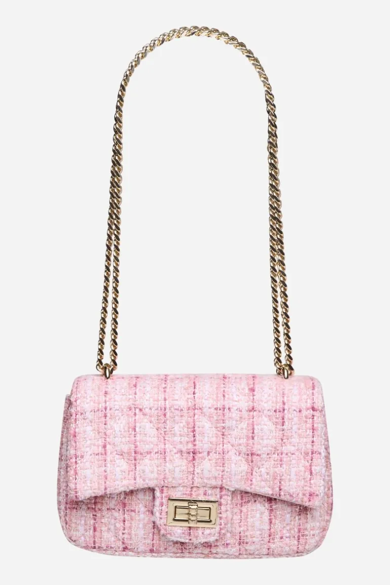 Diese stilvolle Tweed-Bag mit goldenen Kettenriemen und edlem Verschluss ist ein absoluter Hingucker! Das Bouclé-Material verleiht Deinen Outfits eine elegante Note und macht sie perfekt für besondere Anlässe und Abendveranstaltungen.