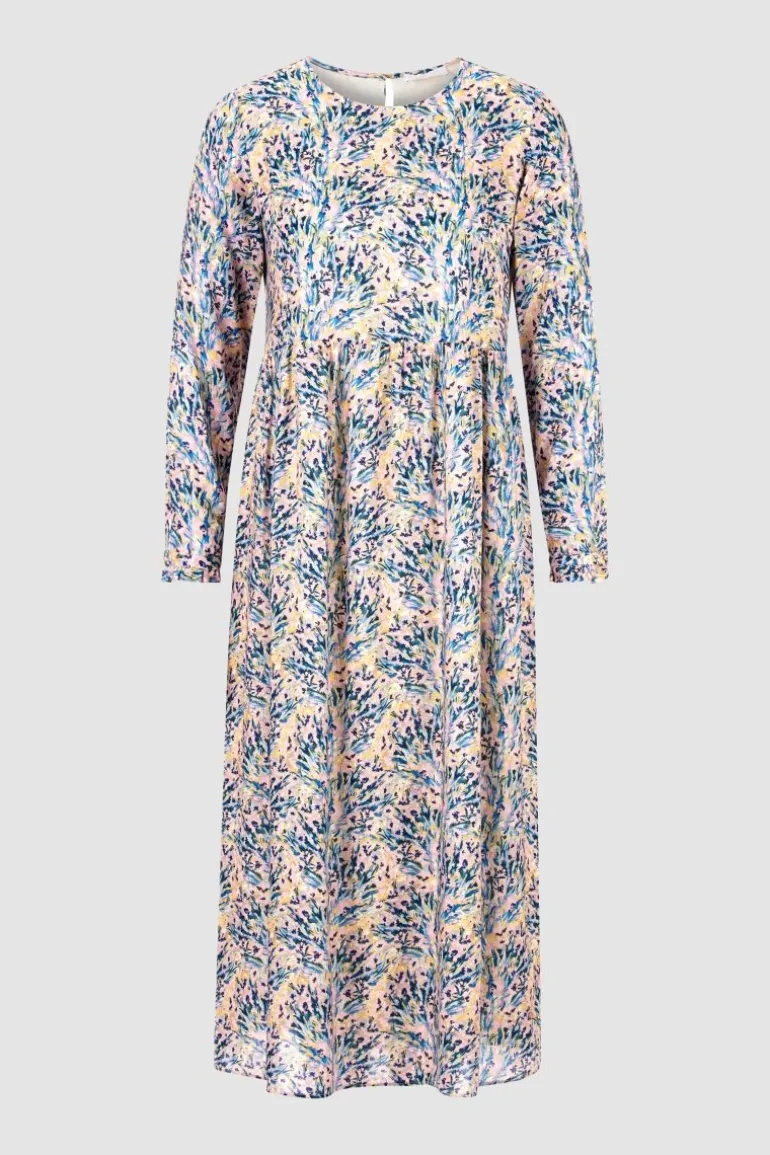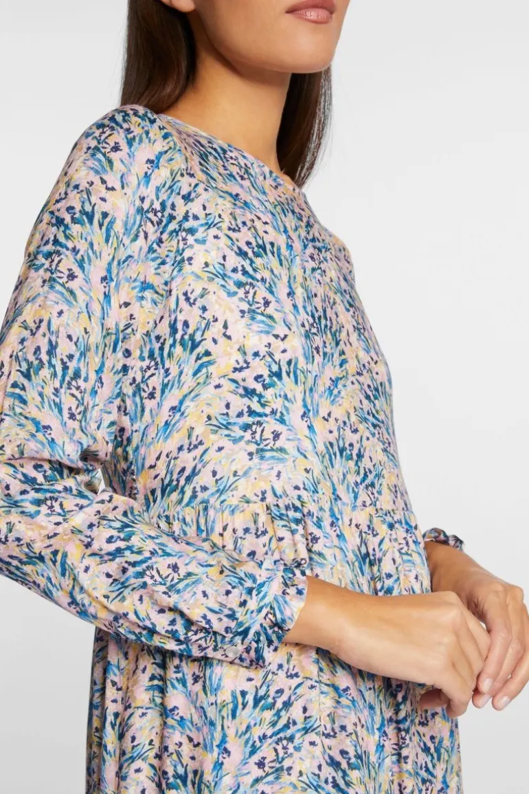 Herrlich feminin überzeugt dieses Kleid mit seinem romantischen Flower-Look. Das Oberteil ist locker geschnitten, der midilange Rock hat eine weit schwingende Form. Rüschendetails am Manschettenärmel und ein zarter Knopf im Nacken unterstreichen den verspielten Look.