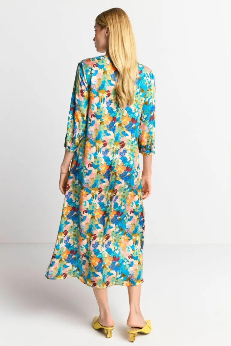 Dieses sommerliche Midikleid mit 3/4-Ärmeln und buntem Blumenprint wird dank der fließenden Passform und V-Ausschnitt zum perfekten It-Piece für warme Tage! Wir kombinieren es am liebsten zu gelben Pumps für einen stilvollen Look.