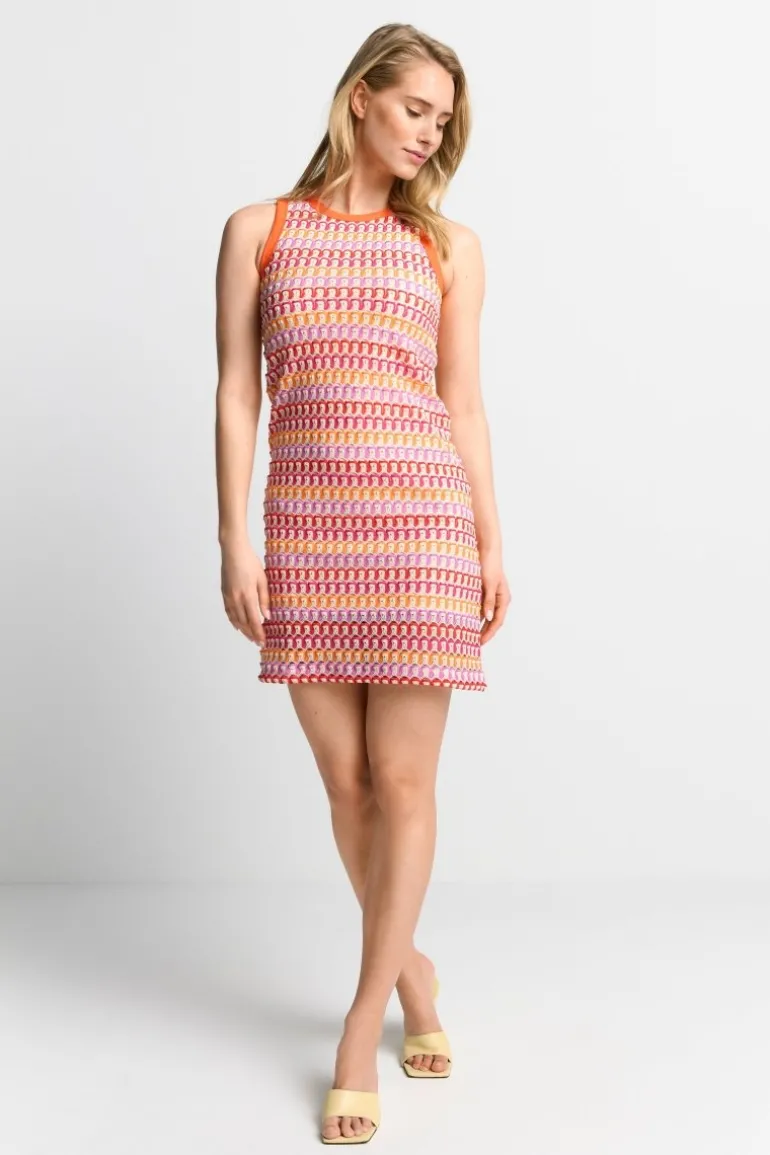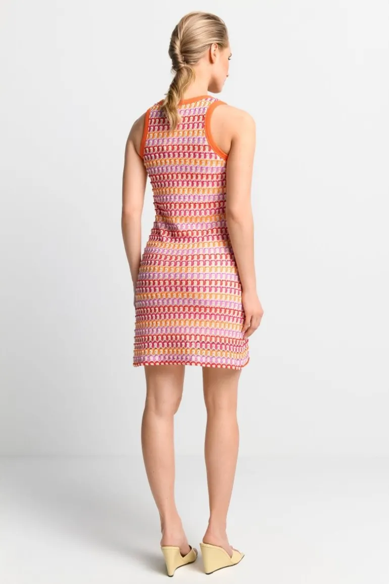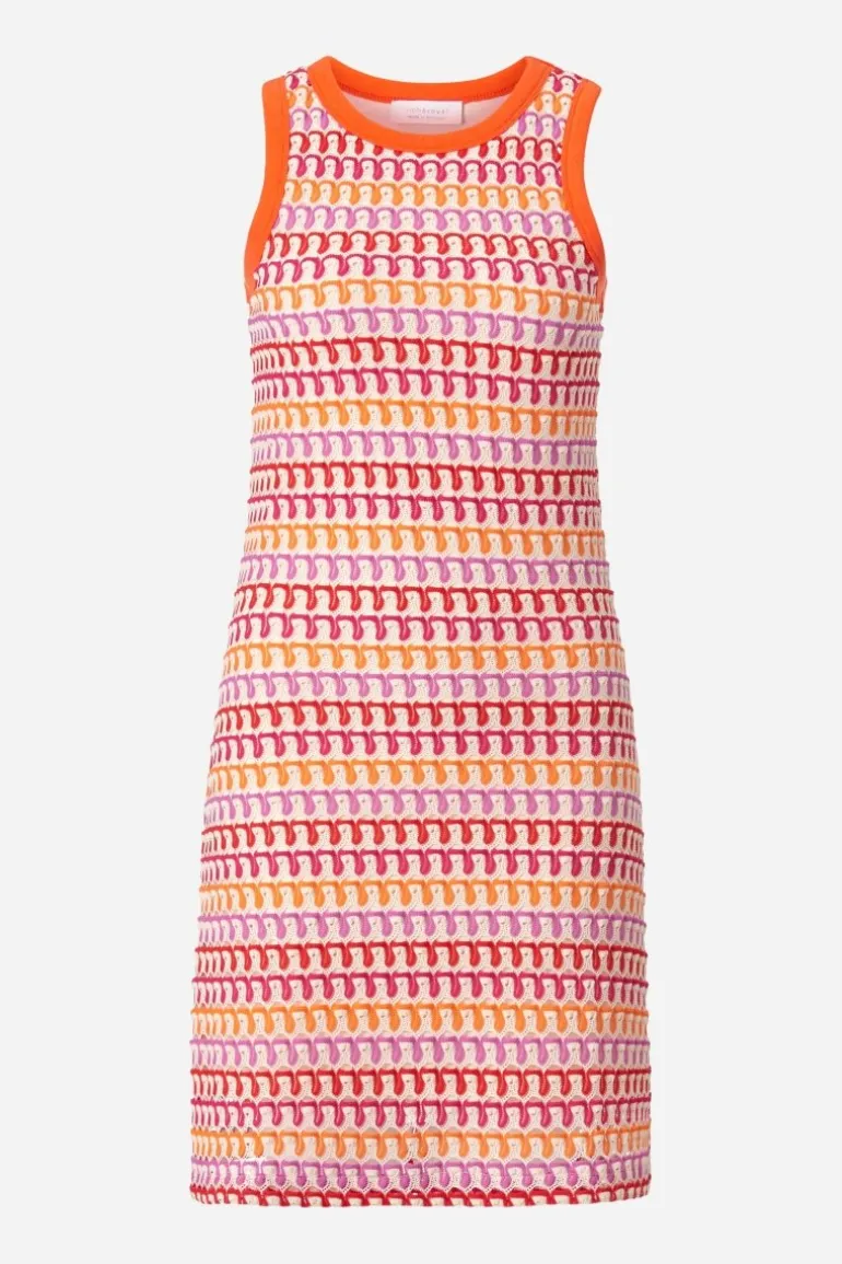 Dieses figurbetonte Statement-Kleid aus Jerseystrick präsentiert sich mit einem farbenfrohen Retro-Muster. Dank des ärmellosen Schnitts ist es sowohl für Sommertage als auch für Gartenpartys und Dinnerabende ein Must-have!