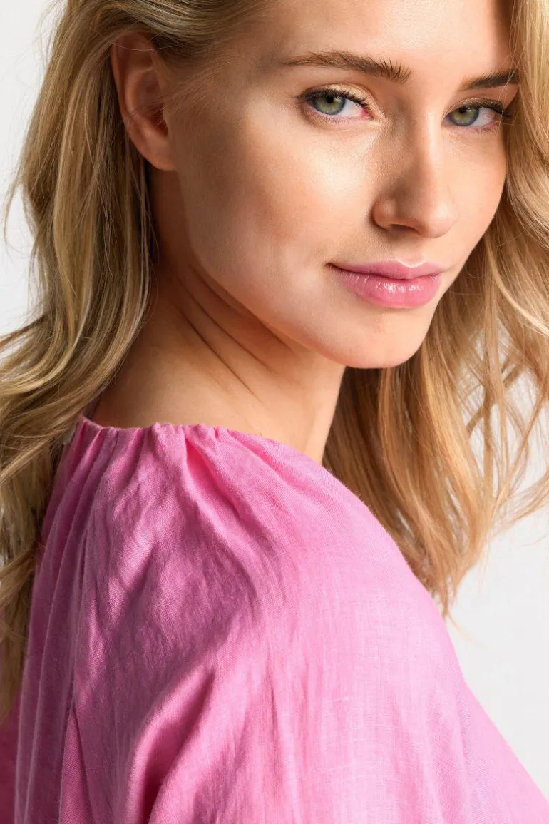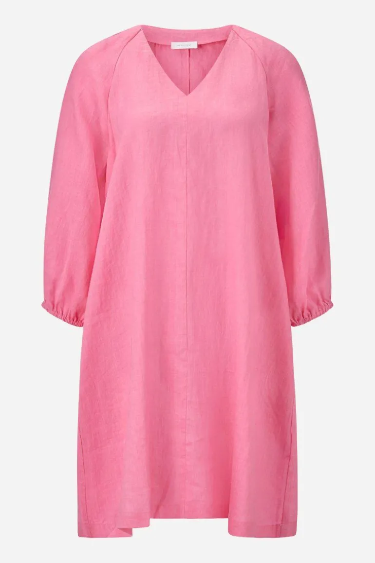 Dieses pinke Leinenkleid garantiert durch seine lockere Passform und stylische Dreiviertelärmel maximalen Tragekomfort. Es kombiniert moderne Eleganz mit sommerlicher Leichtigkeit und ist perfekt für einen stilbewussten Auftritt zu jedem Anlass.