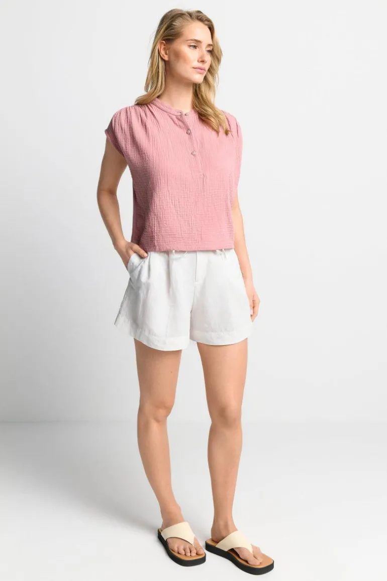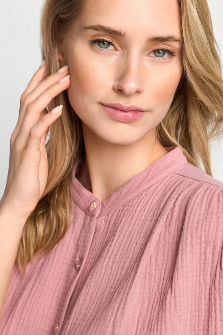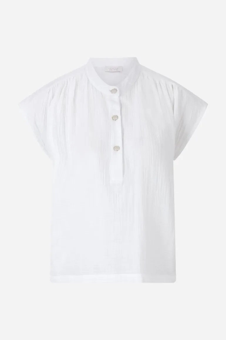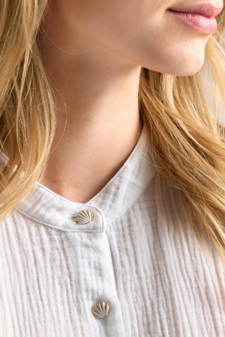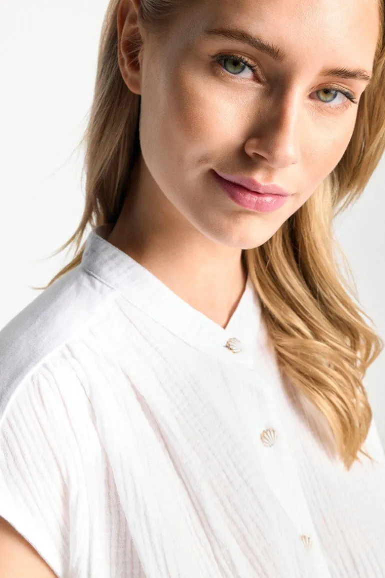 Diese elegante Musselin-Kurzarmbluse spielt mit Texturkontrasten: Weicher Baumwollkrepp trifft auf einen glatten Rücken. Die lockere Passform und goldene Muschelknöpfe machen sie zum perfekten It-Piece für luftige Business- oder Freizeit-Outfits.