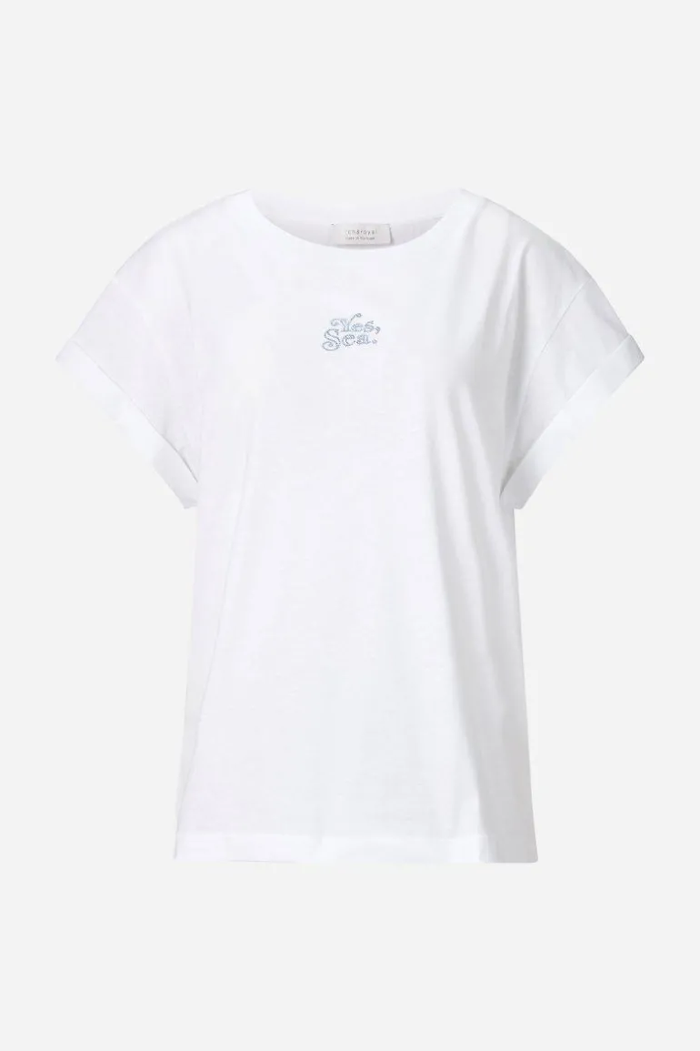 Dieses weiße T-Shirt präsentiert sich mit einem feinen Strass-Schriftzug. Der lässige Schnitt und der zeitlose Crew-Neck machen es zum idealen Begleiter für maritime Abenteuer und zum stilvollen Basic im Alltag, das Du vielseitig kombinieren kannst.