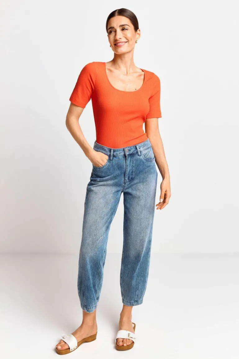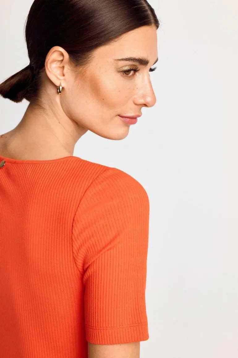 Dieses figurbetonte T-Shirt ist dank seiner feinen Rippstruktur ein vielseitiges Trend-Basic mit weicher Haptik. Gefertigt in Portugal, verbindet es lässige Eleganz mit Nachhaltigkeit und ist ein Must-have für entspannte Casual-Looks.