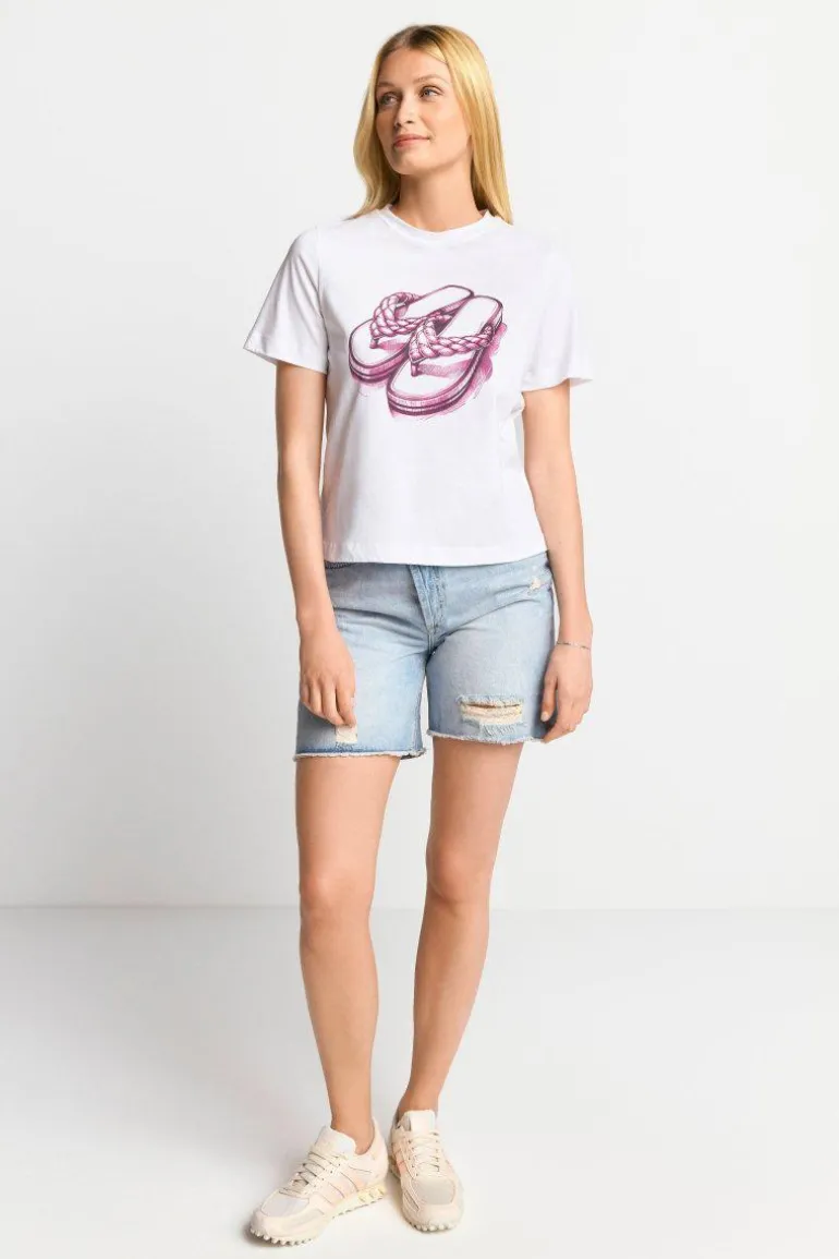 Dieses weiße T-Shirt mit strassverziertem Print lässt Dich von weiten Stränden träumen. Seine weiche Baumwollqualität verspricht Tragekomfort und Lässigkeit. Wir kombinieren es am liebsten zu stylischen Jeansshorts.