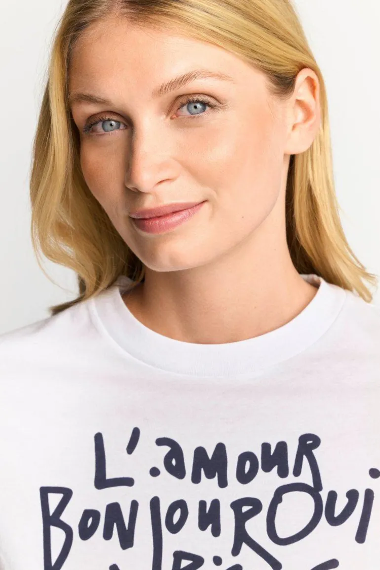 Dank stylischem Statement-Print auf Französisch ist dieses weiße T-Shirt perfekt für coole Casual-Looks! Der lockere Schnitt und die weiche Baumwolle machen es zum lässigen Must-have für Freizeitoutfits.